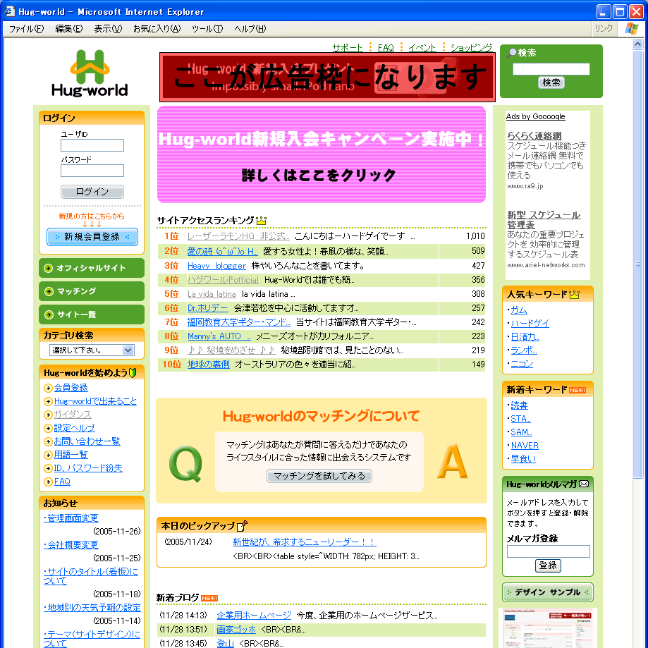 Hug-worldのバナー広告はトップページはもちろん、会員が作成したサイトの上部にも露出しております。