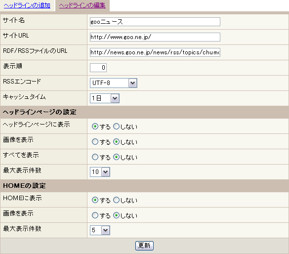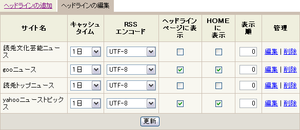 登録されているヘッドラインが一覧で表示されます。 一覧で表示されている状態で、「キャッシュタイム」「RSSエンコード」「ヘッドラインページに表示」「HOMEへの表示」は変更が可能です。 変更後、「更新」ボタンをおして下さい。