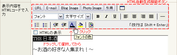 - 編集したい部分をドラッグして選択し、HTML自動編集機能ボタンをクリックします。