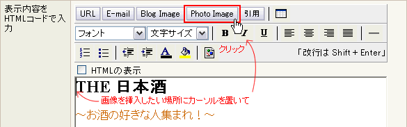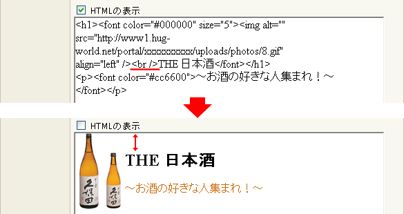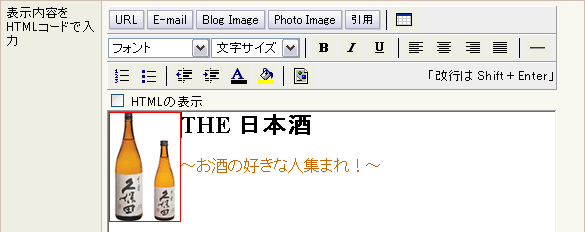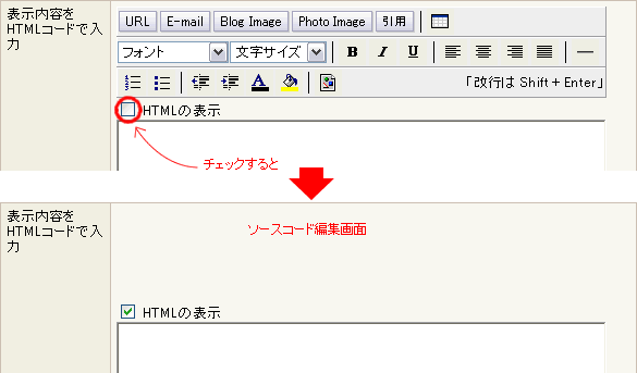 - 「HTMLの表示」をチェックし、ソースコード編集画面に切り替えます。