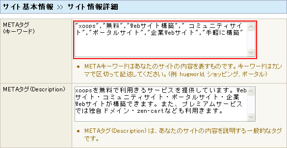 ここでは設定した内容はキーワードとしてmetaタグのkeywordに埋め込まれます。